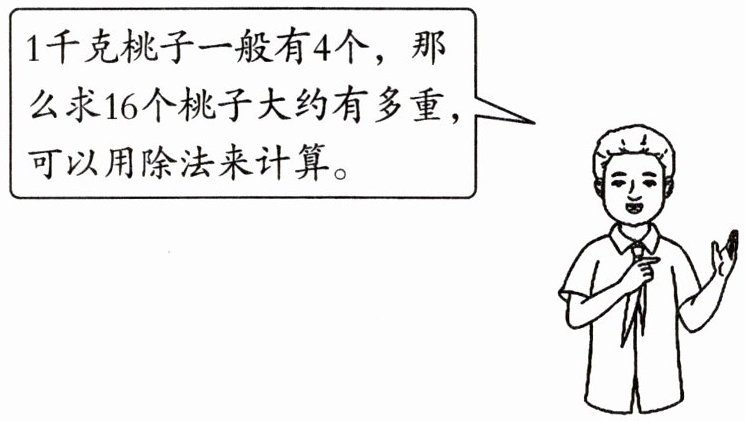 1 千克桃子一般有 4 个,那么求 16 个桃子大约有多重,可以用除法来计算。