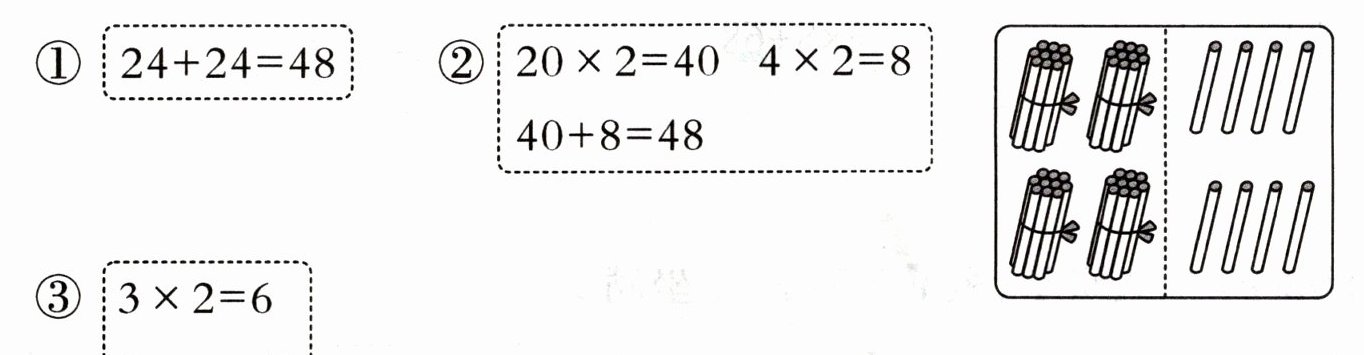 )。$\begin{matrix}①\begin{matrix}24 + 24 = 48\end{matrix} & ②\begin{matrix}20×2 = 40 & 4×2 = 8 \\ 40 + 8 = 48\end{matrix} \\③\begin{matrix}3×2 = 6 \\ 8×6 = 48\end{matrix} \end{matrix}$