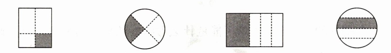 3. 哪个图形里的涂色部分是整个图形的$\frac{1}{4}$?在相应的( )里画“√”。