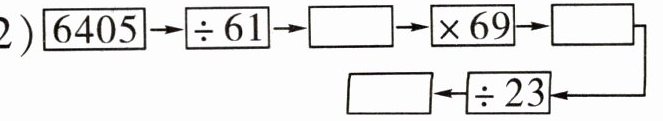 (2) $\boxed{6405} \xrightarrow{÷61} \boxed{} \xrightarrow{×69} \boxed{} \xrightarrow{÷23} \boxed{}$