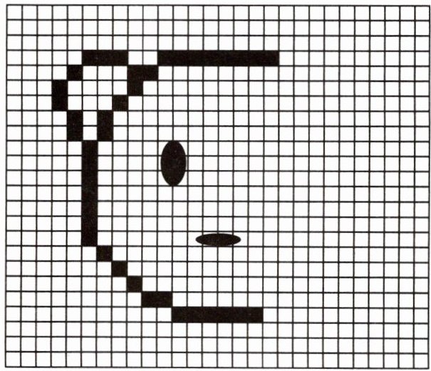 复原后的图形如下(用文字描述位置):在对称轴左侧,眼睛椭圆在相应对称位置,鼻子半圆在相应对称位置,轮廓按照对称补全,使整个图形成为完整的轴对称图形。 (实际需在方格纸上准确画出)