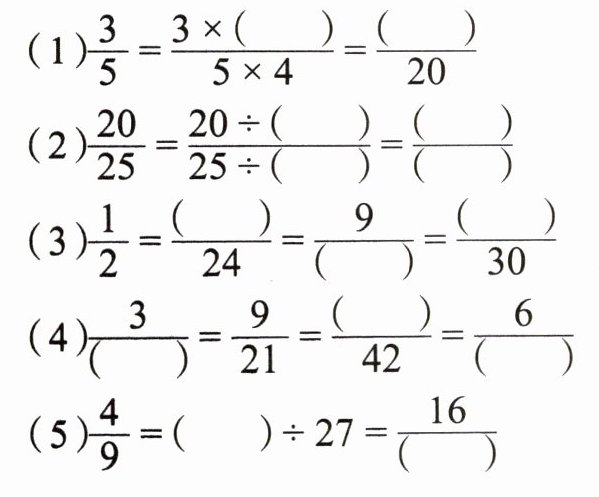 (1)$\frac{3}{5}=\frac{3×(\ )}{5×4}=\frac{(\ )}{20}$