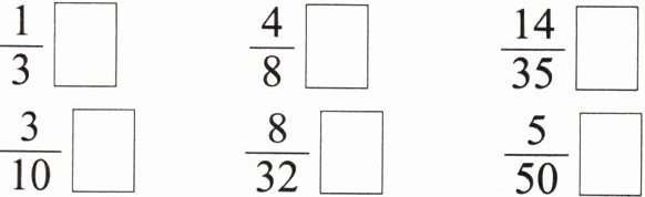 $\dfrac{3}{10}□$ $\dfrac{8}{32}□$ $\dfrac{5}{50}□$