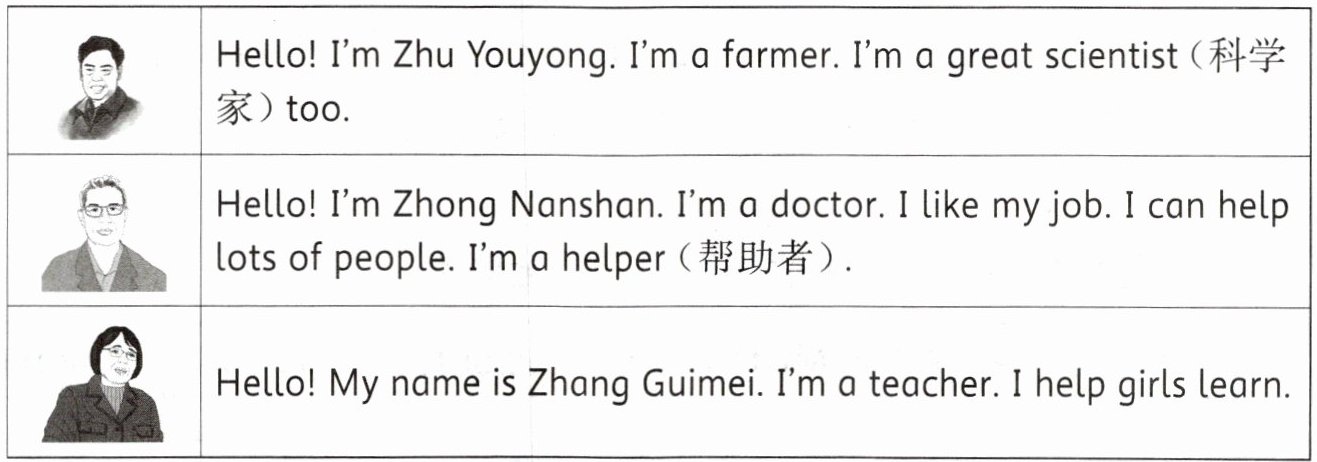 ||Hello! I'm Zhong Nanshan. I'm a doctor. I like my job. I can help lots of people. I'm a helper (帮助者).|