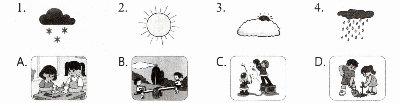 1. cold, snowy 2. fly a kite 3. make a snowman 4. see a film