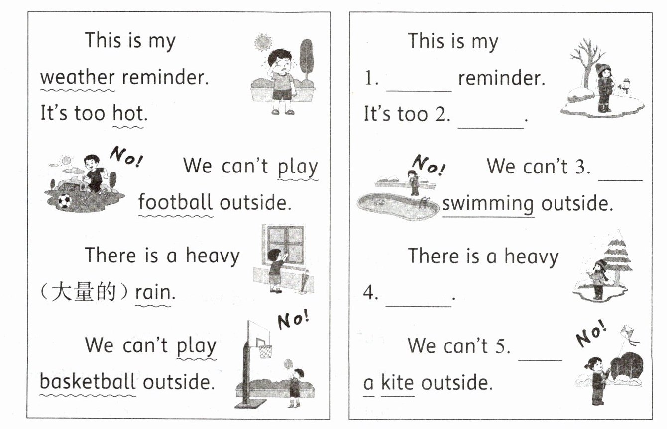 十二、阅读并模仿左边 Xiao Ming 制作的“天气提醒事项”,完成右边 Xiao Qi 的“天气提醒事项”。(5分)