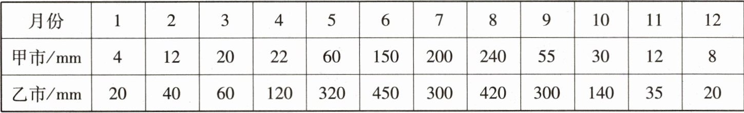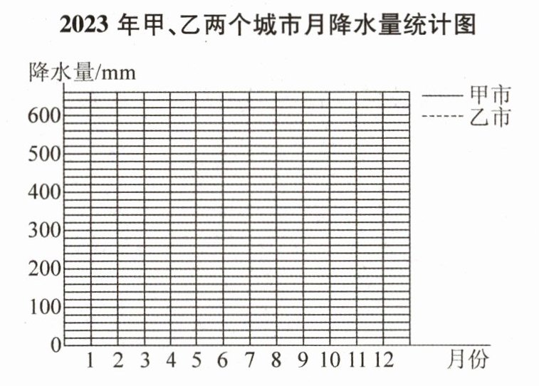 3. 2023 年甲、乙两个城市月降水量的统计如下表。[(1)题 4 分,(2)(3)题每空 2 分,(4)(5)题每题 4 分]
