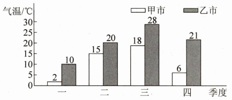 3. 下图是 2023 年甲市和乙市各季度平均气温的条形统计图。
