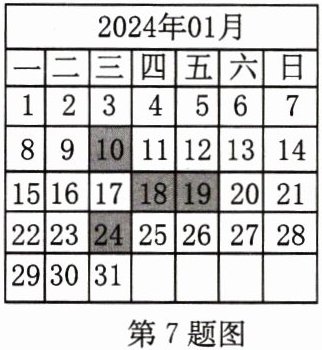 7. 如图,在2024年1月的日历表中用图形框框出10,18,19,24四个数,它们的和为71.若保持图形框的整体形状不变,将其在日历表中平移,还是框出四个数,则它们的和不可能是(