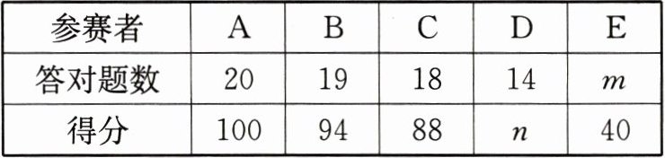 参赛者E得分40分,设答对$m$题,答错$20 - m$题,可得$5m + (20 - m)×(-1)=40$,即$5m - 20 + m=40$,$6m=60$,解得$m=10$。