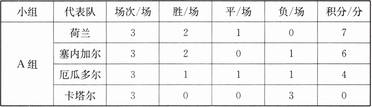 11. 2022年世界杯于11月21日在卡塔尔召开.在小组赛阶段,32支球队根据自身实力所处的不同档次,以及所属大洲的情况进行抽签分组,每个小组4支球队.每支球队会和所在小组内其他3支球队都进行比赛,以下是世界杯小组赛A组的积分表.