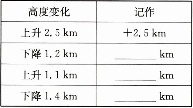 解:上升的高度为$\vert+2.5\vert+\vert + 1.1\vert=2.5 + 1.1=3.6(km)$,下降的高度为$\vert-1.2\vert+\vert-1.4\vert=1.2 + 1.4=2.6(km)$。