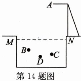 14. 如图,$MN$为一个泳池内的水平面.某跳水运动员(看作一个点)从点$A$处起跳,点$B$,$C$,$D$为他三次跳水后落入水中的位置,已知点$B和D的深度差是1.5m$,点$C与A的高度差为10.5m$.以水面为基准,在水面上方记为正,下方记为负,点$A表示的是+7.5m$,点$B表示的是-2m$,则点$B比C$高多少?点$D比A$低多少?
