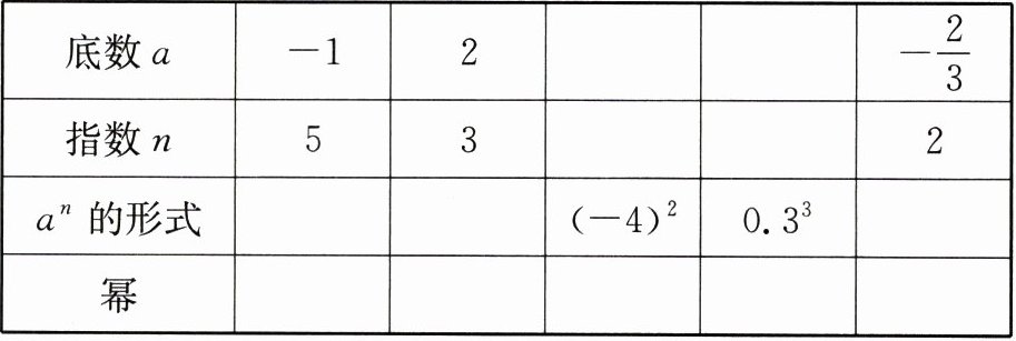 |$a^{n}$的形式| $(-1)^5$ | $2^3$ | $(-4)^{2}$ | $0.3^{3}$ | $\left(-\frac{2}{3}\right)^2$ |