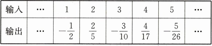 | 输出 | ··· | $ -\dfrac{1}{2} $ | $ \dfrac{2}{5} $ | $ -\dfrac{3}{10} $ | $ \dfrac{4}{17} $ | $ -\dfrac{5}{26} $ | ··· |