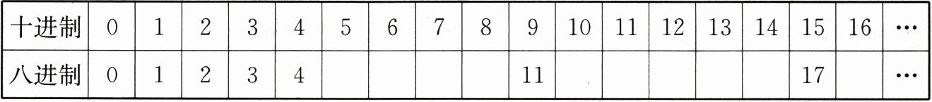 |八进制|0|1|2|3|4|5|6|7|10|11|12|13|14|15|16|17|20|…|