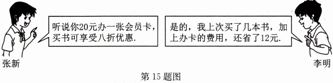 15. 张新和李明到图书城去买书,请你根据他们的对话内容(如图),求出李明上次所买书籍的原价.