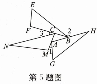 5. 三个全等三角形按如图所示方式摆放,则$∠1 + ∠2 + ∠3$的度数为