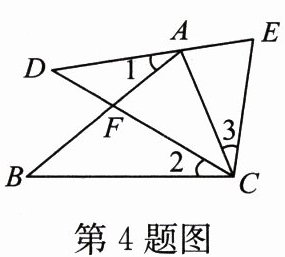 4. 如图,点 A 在 DE 上,点 F 在 AB 上,且$AC = CE$,$∠1 = ∠2 = ∠3$,则 DE 的长等于(
