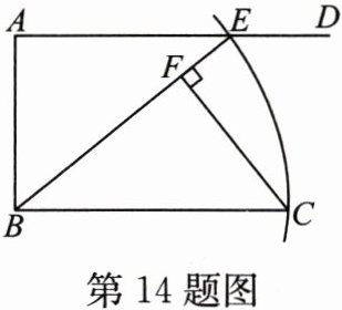14. 如图,$AD // BC$,$∠BAD = 90^{\circ}$,以点 B 为圆心,BC 长为半径画弧,与射线 AD 相交于点 E,连接 BE,过点 C 作$CF \perp BE$,垂足为 F。不添加辅助线找出图中与 BF 相等的线段,然后再加以证明。