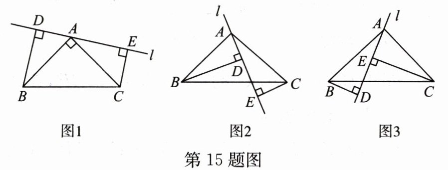 15. 在$\triangle ABC$中,$∠BAC = 90^{\circ}$,$AB = AC$,l 是过点 A 的一条直线,$BD \perp AE$,$CE \perp AE$。