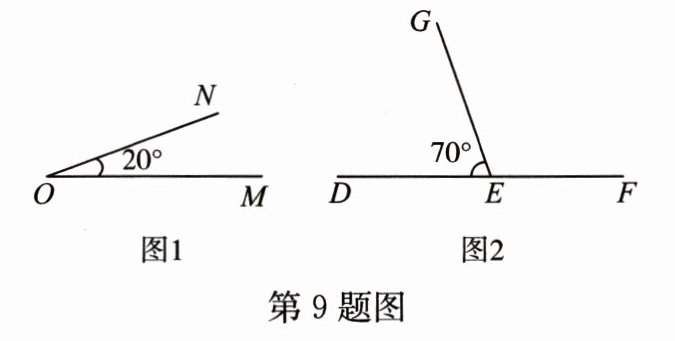 9. 图1中,$\angle MON = 20^{\circ}$。图2中,$\angle DEG = 70^{\circ}$,请在图2中直线$DF的上方作射线EH$,使$\angle HEG = 90^{\circ}$。(不写作法,保留作图痕迹)