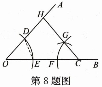 8. 如图,已知$\angle AOB = \alpha$,点$C为射线OB$上一点,用尺规按如下步骤作图:①以点$O$为圆心,以任意长为半径作弧,交$OA于点D$,交$OB于点E$;②以点$C$为圆心,以$OD$长为半径作弧,交$OC于点F$;③以点$F$为圆心,以$DE$长为半径作弧,交前面的弧于点$G$;④连接$CG$并延长,交$OA于点H$,则$\angle AHC$的度数为(