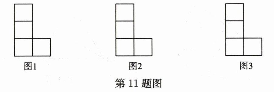 11. 如图,是由四个边长相等的小正方形组成的“L”形图案,请你在图中添加一个相同边长的小正方形,使整个图形成为一个轴对称图形,并画出它的对称轴 l.(请用三种不同的添加方法,分别在下面三个图中画出来)