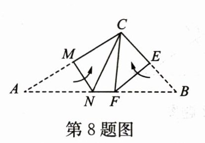 8. 如图,在△ABC 中,∠A = 32°,∠B = 47°,将点 A 与点 B 分别沿 MN 和 EF 折叠,使点 A,点 B 都与点 C 重合,则∠NCF 的度数为(