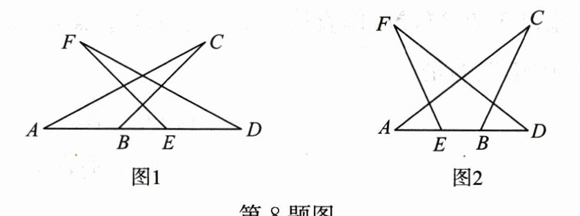 8. 如图,$ \triangle ABC \cong \triangle DEF $,且 $ A,B,D,E $ 四点在同一直线上,请仅用无刻度的直尺作图.(不写作法,保留作图痕迹)