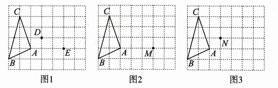 图1中,通过数格子,确定$D$点向右一个单位,$E$点向左一个单位,再通过$AC$水平宽度为$2$,$AB$垂直宽度为$1$,$BC$为斜边,确定$F$点,使得$\triangle DEF$与$\triangle ABC$全等(答案不唯一,可通过平移、旋转、翻折得到不同位置的全等三角形,以下给出一种答案)。