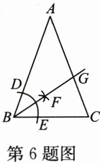 6. 如图,在 $\triangle ABC$ 中,$AB = AC$,$\angle A = 40^{\circ}$,按如下步骤作图:①以点 $B$ 为圆心,适当长为半径画弧,分别交 $BA$,$BC$ 于点 $D$,$E$;②分别以点 $D$,$E$ 为圆心,大于 $\frac{1}{2}DE$ 长为半径画弧,两弧在 $\angle ABC$ 的内部相交于点 $F$,作射线 $BF$ 交 $AC$ 于点 $G$,则 $\angle ABG$ 的大小为