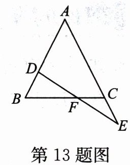 13. 如图,在$\triangle ABC$中,$AB = AC$,点$D在AB$上,点$E在AC$的延长线上,且$BD = CE$,$DE与BC相交于点F$. 求证$DF = EF$.