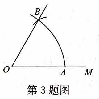 3. 如图,以点 O 为圆心,任意长为半径画弧,与射线 OM 交于点 A,再以点 A 为圆心,AO 长为半径画弧,两弧交于点 B,画出射线 OB,则∠AOB = (