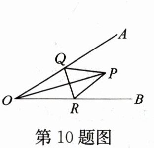 10. 如图,$ \angle AOB = 30^\circ $,$ \angle AOB $ 内有一定点 $ P $,且 $ OP = 10 $. 在 $ OA $ 上有一点 $ Q $,$ OB $ 上有一点 $ R $,若 $ \triangle PQR $ 的周长最小,则周长的最小值是
