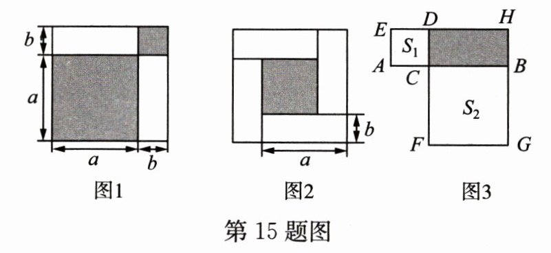 15. 现有长与宽分别为$a$,$b$的小长方形若干个,用两个这样的小长方形拼成如图1的图形,用四个相同的小长方形拼成如图2的图形.请认真观察图形,解答下列问题: