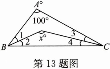 13. 如图,$\angle 1 = \angle 2$,$\angle 3 = \angle 4$,$\angle A = 100^{\circ}$,求$x$的值.