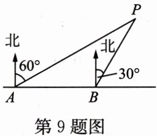 9. 如图,李明同学在东西方向的滨海路$A$处,测得海中灯塔$P在北偏东60^{\circ}$方向上,他向东走至$B$处,测得灯塔$P在北偏东30^{\circ}$方向上,则从灯塔$P观测A$,$B$两处的视角的度数是 (