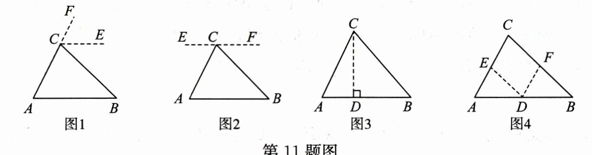 11. 在探究证明“三角形的内角和是$180^{\circ}$”时,综合实践小组的同学作了如下四种辅助线,其中不能证明“三角形的内角和是$180^{\circ}$”的是 (