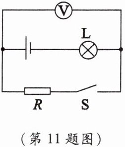 11. 如图所示,闭合开关$S$,灯$L$发光一段时间后熄灭,电压表示数变大。为查找电路故障原因,小马将导线连接在灯$L$两端时,发现灯泡不亮,电压表示数不变;将导线连接在开关$S$两端时,发现灯泡不亮,电压表示数不变;将导线连接在电阻$R$两端时,发现灯泡不亮,电压表示数不变;将导线连接在电阻$R和开关S$两端时,灯泡发光,电压表示数变为$0$。则故障的原因可能是(