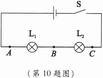 10. 如图所示的电路中,电源电压为$3V$,闭合开关$S$后,两灯均不亮。用导线$a将A$、$B$两点连接起来,发现灯$L_{1}$不亮,灯$L_{2}$亮,则故障原因可能是