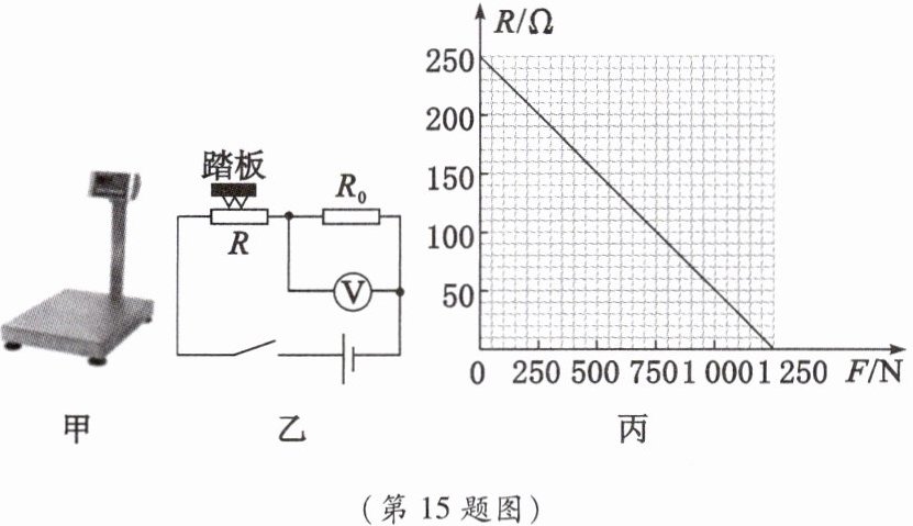 15. 图甲是某型号的电子秤,其原理结构如图乙所示,$R_{0}$为定值电阻,$R$是压敏电阻,其阻值随所受压力$F$变化的关系如图丙所示,改写电压表(测量范围为$0\sim3V$)的表盘数值后可直接读出所称物体的质量。设踏板的质量为$5kg$,电源电压保持$9V$不变,$g取10N/kg$。