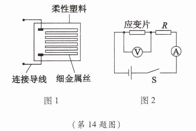 14. 将一根细金属丝嵌入柔性塑料中,可以制成用来检测物体形变的器件应变片,其结构如图1所示。将它接入如图2所示的电路中,电源电压不变,R为定值电阻,闭合开关S,当应变片随被检测物体发生拉伸形变时,塑料中的金属丝会被拉长变细,导致电阻变大,则电路中的(