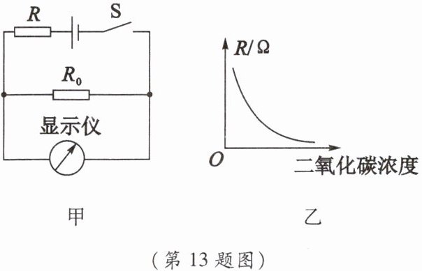 13. 教室长时间密闭会导致室内二氧化碳浓度上升,从而影响学生的听课效率。如图甲所示是某科技小组设计的检测二氧化碳浓度的电路原理图,电源电压保持不变,R₀为定值电阻,R是检测二氧化碳浓度的气敏电阻,其阻值与二氧化碳浓度的关系如图乙所示。闭合开关S,当二氧化碳浓度变大时,下列说法正确的是(