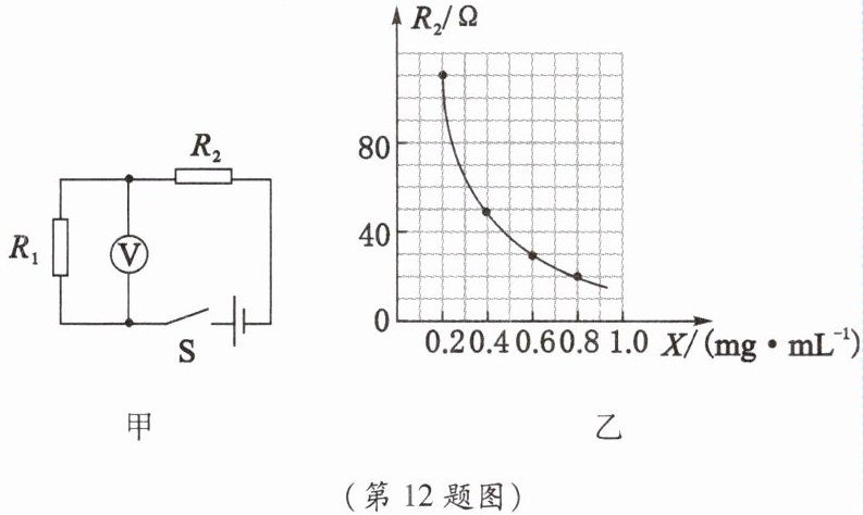 12. 如图甲所示是酒精浓度检测仪的电路原理图,其中电源电压恒为6V,定值电阻$R_1$的阻值为20Ω,传感器$R_2$的阻值与血液酒精浓度X的关系如图乙所示,若血液酒精浓度≥0.8mg/mL时,则判定被检者为醉驾。下列说法正确的是(