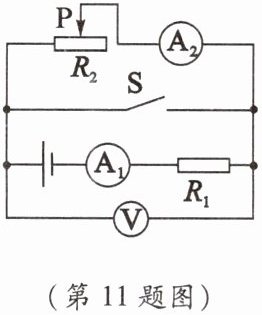 11. 如图所示,电源电压保持不变,开关S断开时,将滑动变阻器的滑片P向左移动的过程中,电流表$A_1$的示数将