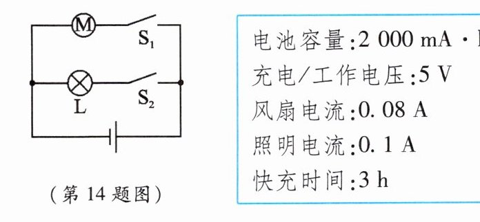 14. 炎热的夏天,便携的迷你小风扇深受人们的喜爱。某小风扇兼具照明功能,其工作电路如图所示,工作参数如下表所示。