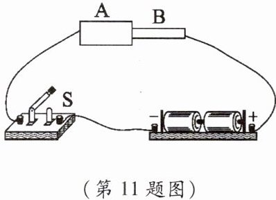 11. 如图所示,导体$A$、$B$是由同种材料制成的,$A和B$等长,但$A比B$的横截面积大,当开关$S$闭合后,在相同时间内,下列叙述正确的是(