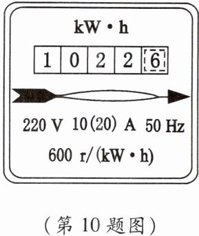10. 如图所示是小英家的电能表表盘示意图,她断开其他用电器,只将电饭煲单独接入电路中,正常工作$1min$,发现电能表转盘转过$10r$。下列说法正确的是(