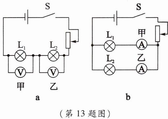 13. 同学们猜想影响电流做功多少的因素包括用电器两端的电压、通过用电器的电流和通电时间,如图a、b所示是小明实验小组的实验电路图。